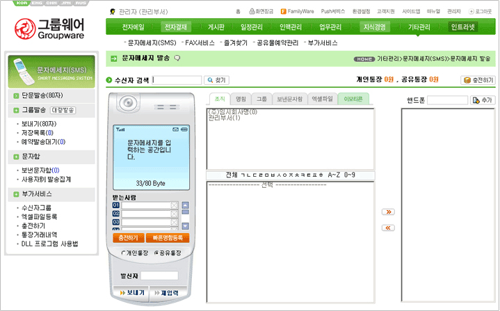 - 문자 메시지나 전자 팩스 이용 시에 공유통장과 개인통장으로 나뉘어 충전 금액 관리.