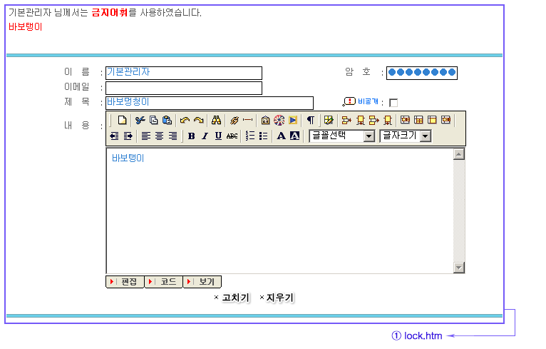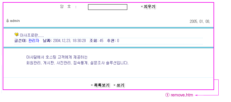 ① remove.htm : 삭제 화면으로 암호 입력과 본문 정보를 포함하는 파일입니다.