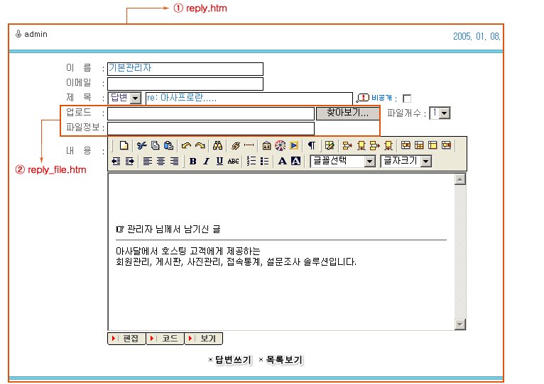 ① reply.htm : 답글 화면의 파일로 첨부파일과 파일정보 항목을 제외한 폼과 버튼을 포함합니다. 반드시 존재해야합니다.