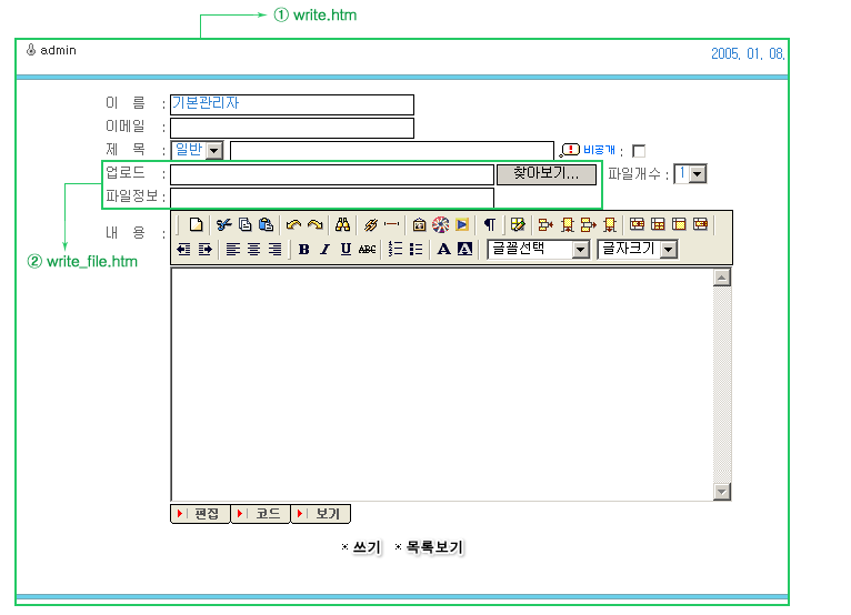 ① write.htm : 글쓰는 화면의 파일로 첨부파일과 파일정보 항목을 제외한 폼과 버튼을 포함합니다. 반드시 존재해야합니다.