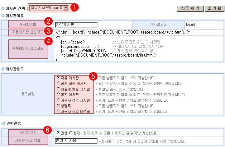 6. 권한설정 : 게시판 사용여부를 정할 수 있으며 정지 선택 시 모든 사용자는 글 읽기만 가능합니다. 게시판 관리 암호는 게시물의수정, 삭제 시 암호로 사용 가능합니다.