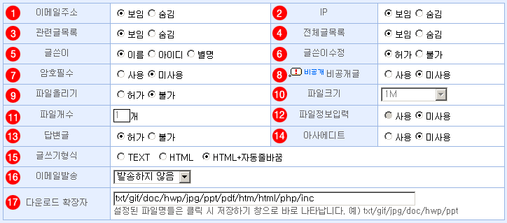15. 글쓰기형식 : 글 쓰기 형식(TEXT, HTML, HTML+자동줄바꿈)을 선택할 수 있습니다.