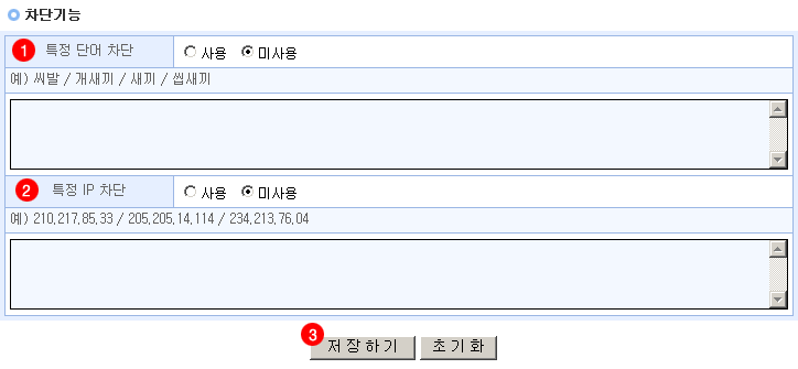 1.특정단어차단 : 사용으로 체크하시면 특정 단어를 차단할 수 있습니다. 욕설방지 기능으로 활용하실 수 있어 유용합니다.