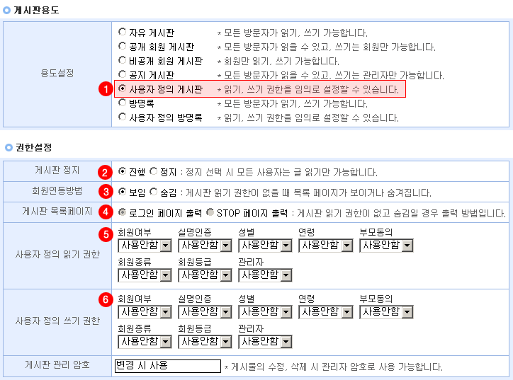 6. 사용자 정의 쓰기 권한 : 사용자 정의 쓰기 권한을 선택할 수 있습니다. 권한의 설정은 회원관리프로그렘에서 변경하십시오.