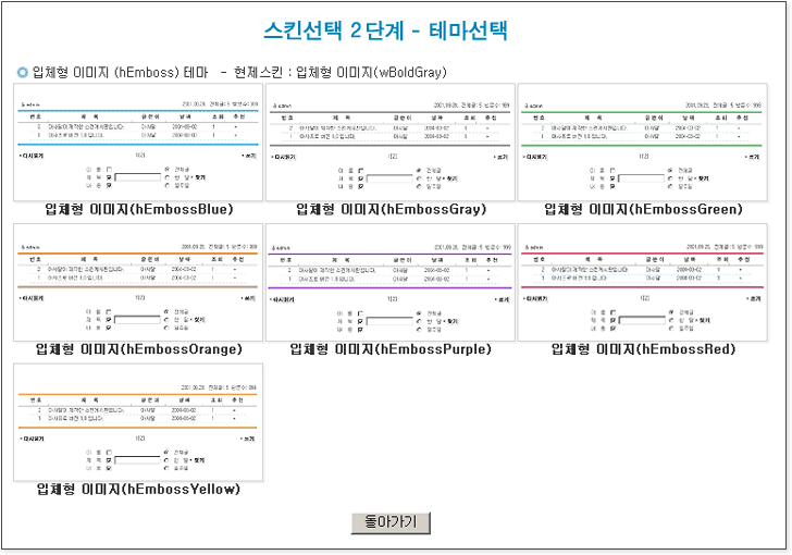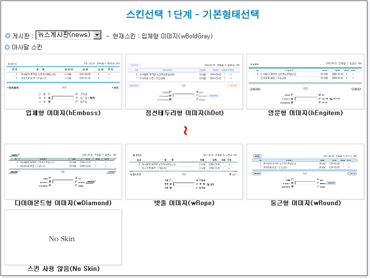 게시판의 스킨을 선택할 수 있습니다. 총 31개의 기본형태의 스킨이 나오며, 기본형을 바탕으로 여러테마의 스킨을 선택할 수 있습니다.