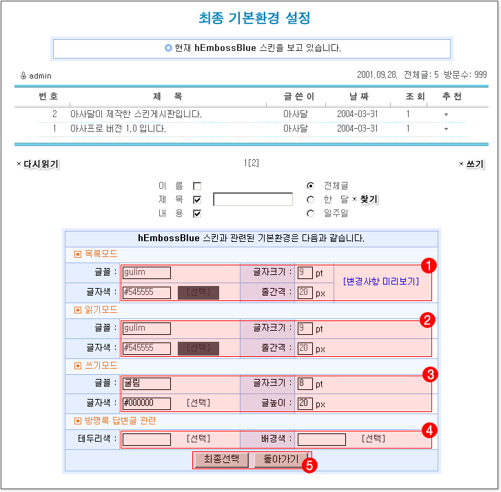 4. 방명록 답변글 관련 : 방명록 답변글 관련 테두리생/배경색 등을 설정합니다.